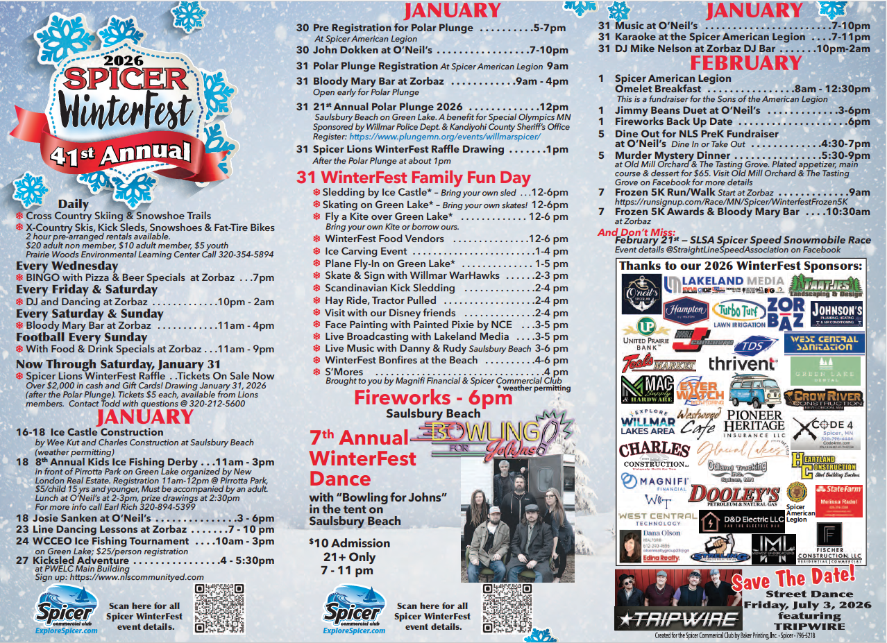 The 41st annual Spicer WinterFest is just around the corner! There are lots of great events planned between January 16th – February 8th, 2026, including the construction of our WinterFest ice castle, the WinterFest family fun day and fireworks, the return of the WinterFest Dance to Saulsbury Beach, and so much more. To get more information on all the great events we have planned for WinterFest 2026, please visit our events calendar.